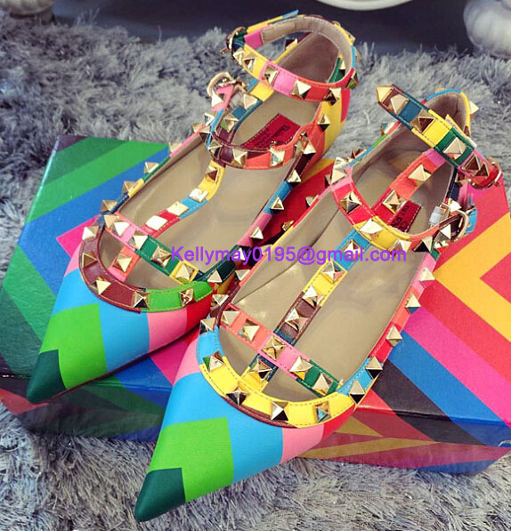 Product Name: Valentino Rockstud Shoes Wide Rainbow Stripe Flats Shoes Green Blue Outlet